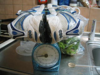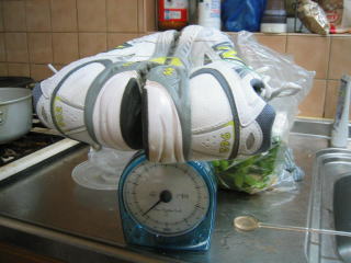 夜、ふとシューズの重さはどの位なのだろうと計って見ました。