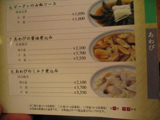 蒸しあわびの冷料理、あわびの醤油煮込み、高級ふかひれの姿煮など美味しそうです。