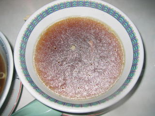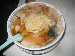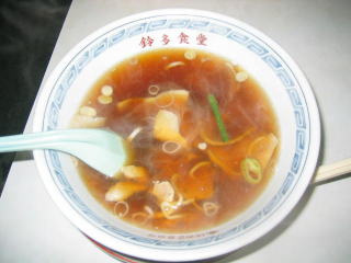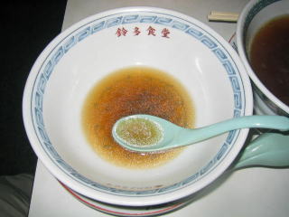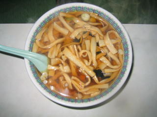 スープはあっさりととした醤油味、キラキラと綺麗な油が見えます。