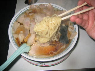 全面を覆うチャーシューの下から白く細いストレートな麺を出します。