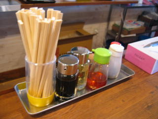 厨房前のカウンター、銀色のお皿は「しょうゆ」や「みそ」、黒いお盆は「つけめん」ができていくようです。