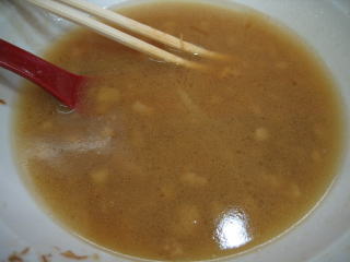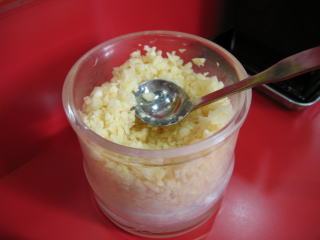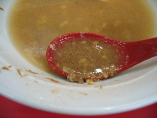 モヤシを移動して出てきたスープに、テーブル上に備え付けのニンニクを3杯、混ぜ込みました。