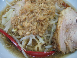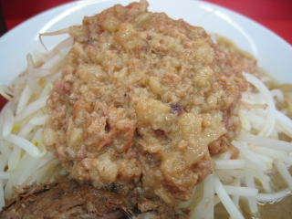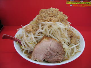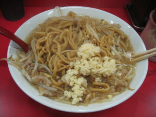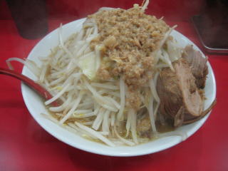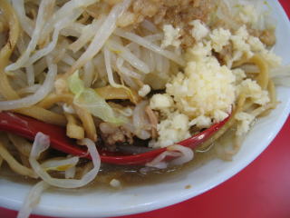 その4人目のお客さんは「野菜マシマシ、アブラマシマシ」で、野菜(モヤシ)崩れ対策か、別皿が付くほどの野菜の量でした。