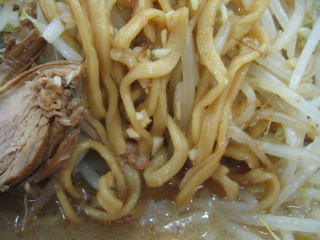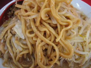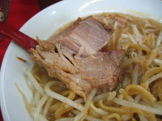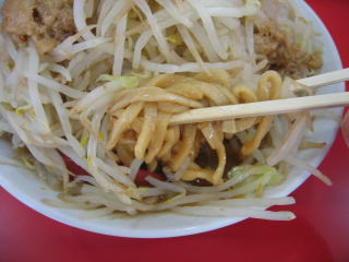 大きな豚(チャーシュー)の塊を後側に移動して、モヤシが崩れない様気を付けながら麺を引っ張り出します。