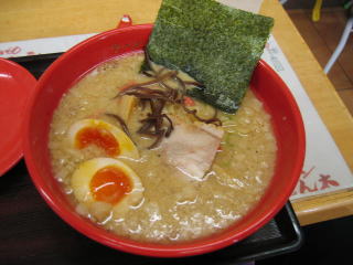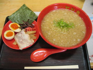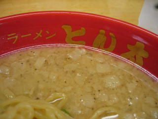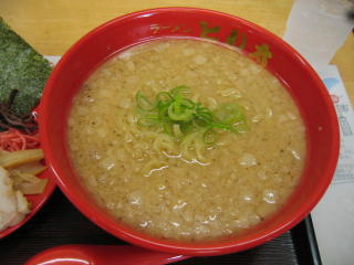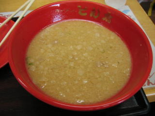 スープはとんこつ醤油、1センチ角位の大きな背脂がたくさん入っています。