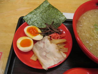 見た目は豪華、味玉、海苔、チャーシュー、メンマ、キクラゲ、紅ショウガが別皿です。