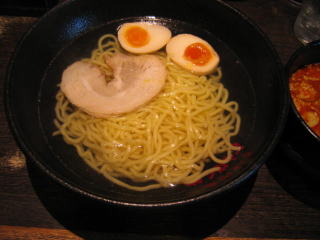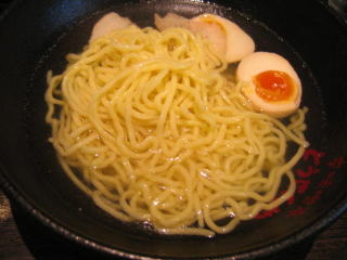 初めてのタイプのつけ麺、麺はお湯の中に浸かっています。