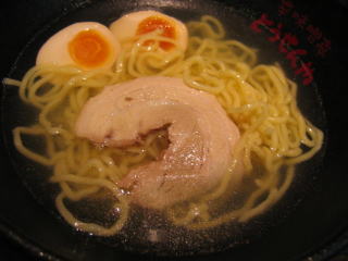 薄いチャーシューも一口でペロリ、です。