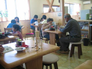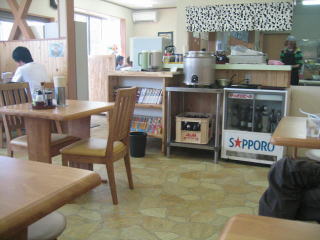 正面入って厨房、左側に6人がけテーブルが2つ、右側には4人がけ、2人がけのテーブルが8つです。