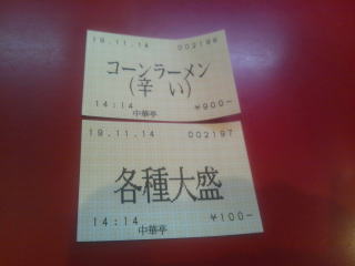 券売機で「コーンラーメン(辛い)」900円と間違えて、「コーン中華」850円を押してしまいました。