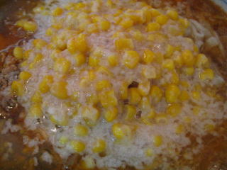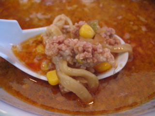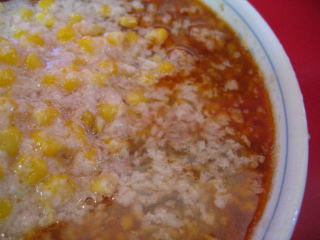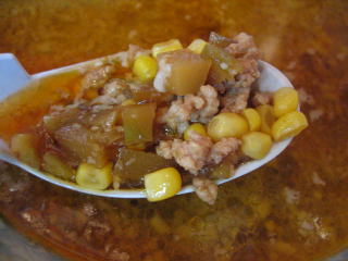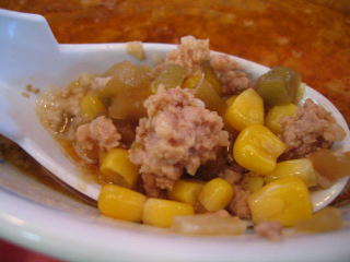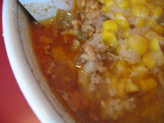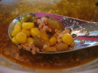 コーンに挽肉、ザーサイとピリ辛スープがアクセントです。