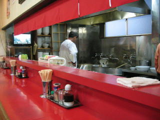 カウンター席に案内されました、「大油でお願いします。」と食券を渡します。