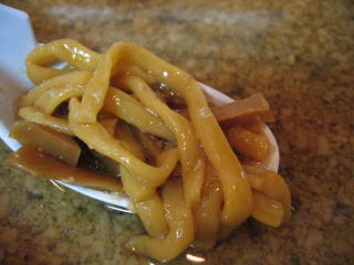 麺は平たく太く、茶色でちょっと柔らかめです。