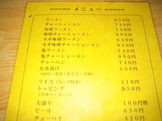平成16年12月19日 長岡市の「中華三昧」にお邪魔しました。 メニューとラーメン630円、塩ラーメン740円です。 ラーメンは縮れ細麺、塩ラーメンは中縮れ太麺でした。 ちょっと飲んでいましたのでこれ以上の感想はありません。