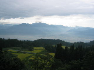 雨が降って着ましたが、展望台に出て魚沼の町を望みますが雲&霧でまったく見えません。