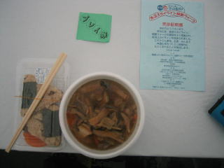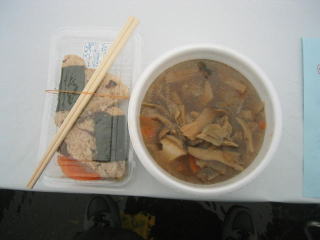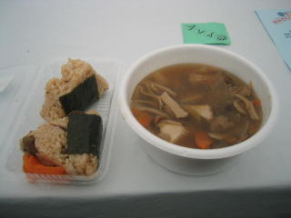 食事券2枚を提出して「まいたけご飯のおにぎり」「まいたけ汁」をいただきました。