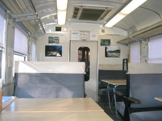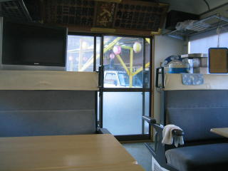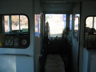 車内です、車両は本来の長さの半分か1/3ほどで切断されており、奥の切断面はサッシ戸になっています。