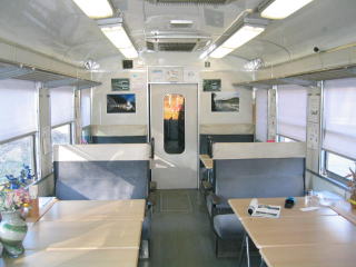 運転席方向はBOXシートとその間にテーブル、一見普通の電車内に見えます。
