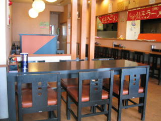入ってすぐ右に券売機、右奥に厨房とカウンター席、左にテーブル席、左奥に小上がりといった配置です。