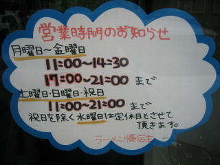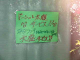 玄関内の張り紙には「平日ランチ(午前11時〜午後2時半)大盛サービス!!」とあり、