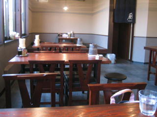 左側の窓際にはテーブル席、奥におトイレと小上がり席が見えます。